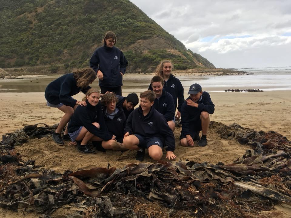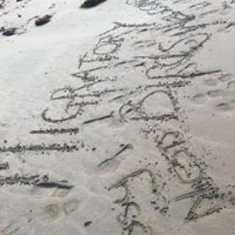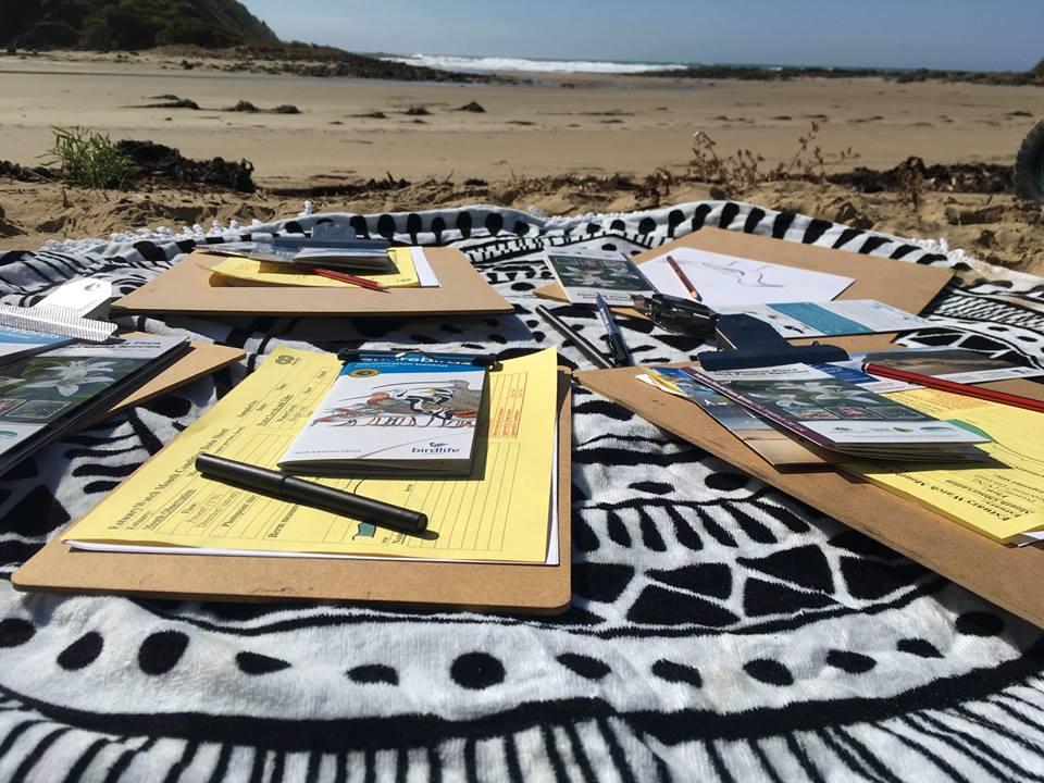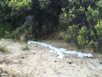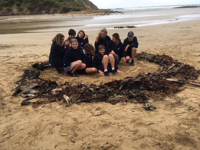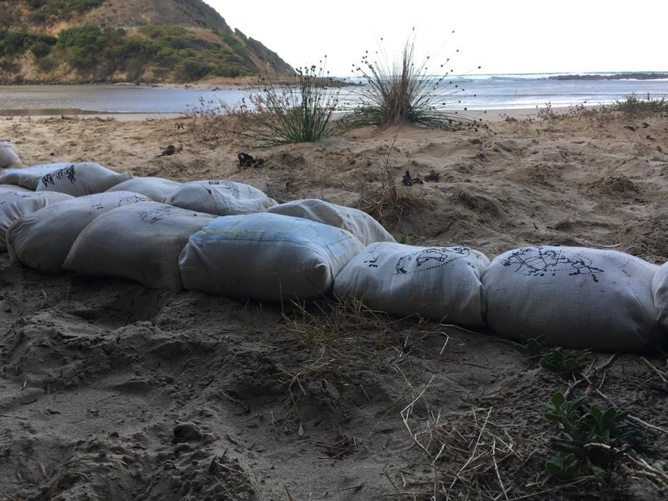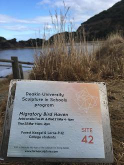 Community Event Migratory Bird Haven Migratory Bird Haven is a Participatory Estuarine Laboratory developed for the Deakin Sculpture in Schools program of Lorne Sculpture Biennale 2018. Forest Keegel worked with Lorne College Year 10 Biology students and EstuaryWatch to monitor the estuary and explore the habitat requirements of the critically endangered Hooded Plover and East Asian Flyway migratory shorebirds. The students collaboratively developed a creative response to implore visitors to St George Estuary to protect migratory and resident shorebirds. 1. A human scale seaweed nest was created. Due to the nature of working in a space that is inundated with water twice a day the original nest washed away but was recreated just out of the tides reach and visitors are invited to add seaweed to the nest 2. Sandbags printed with Hooded plover eggs and the East Asian flyway were placed just out of the tidal zone 3. Messages were written in the sand derived from Birdlife Australia information about shorebirds "Dogs on Leashes Birds on Beaches" as well as welcoming message in the vernacular of motel advertising- 'Warm cosy nest sites' 'Lots of fish to eat' Members of the public were invited to join the artist to monitor estuary health and discover what humans can do to improve Shorebirds chances of survival, like walking on the high tide line to avoid accidentally stepping on a Hooded Plover’s egg. Rose Herben |