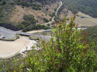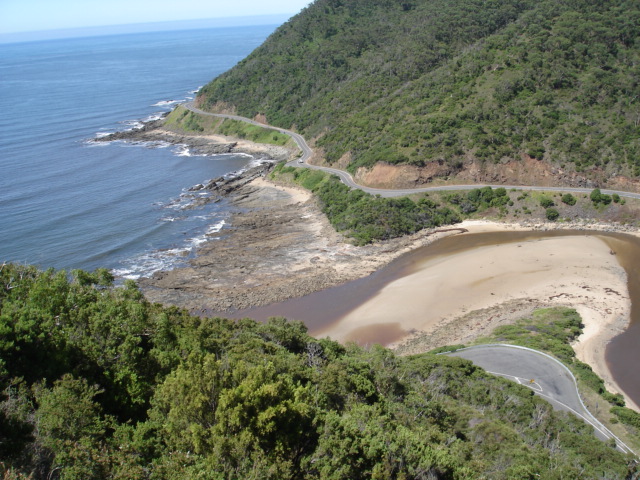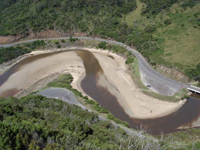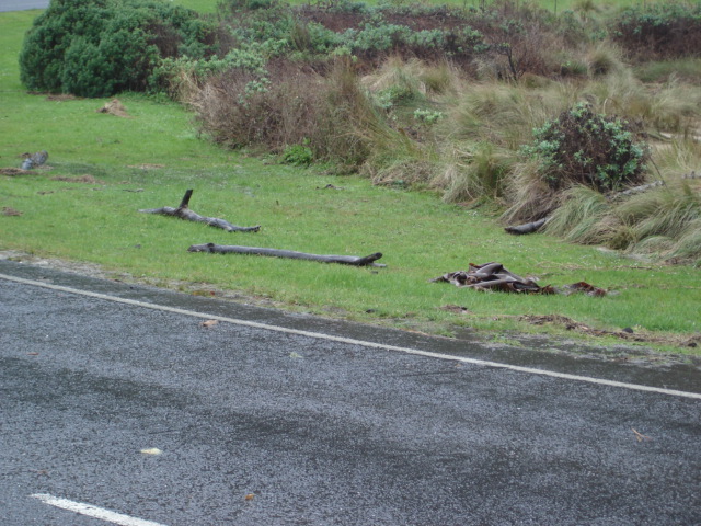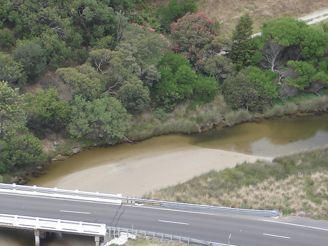 Weather Event Eddge of estuary eroded by high tides andhuge seas. Seaweed deposited on Great Ocean Road by high tide. Tide surging upstream past bridge on Great Ocean Road. Jenny Cerins |