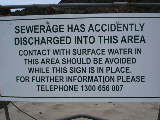 Unusual/Extraordinary occurrence! Notice erected by Barwon Water effectively closing the beach. Enquiry to Barwon water revealed there had been a minor sewerage spill at a sewerage pit at the top of Lorne. The sign was removed within 2 days by Barwon water as they said they had been monitoring water quality and deemed the beach safe. They advised that they do not as a matterof course advise CCMA but do advise the EPA who decide whether to take action. Photo of sign attached Jenny Cerins |
