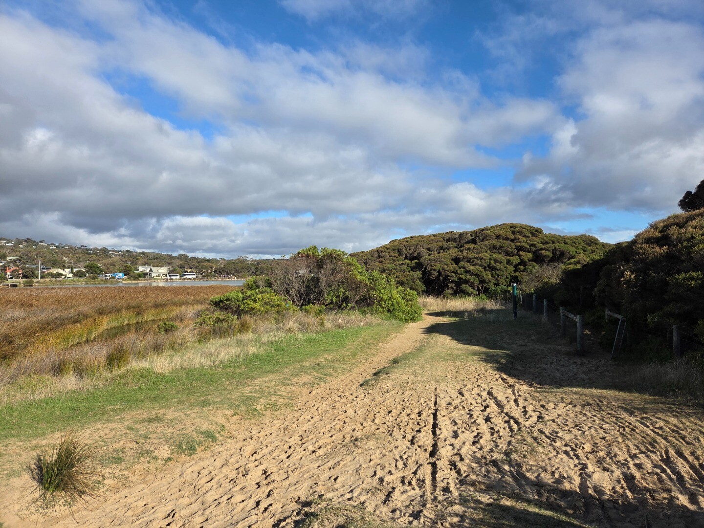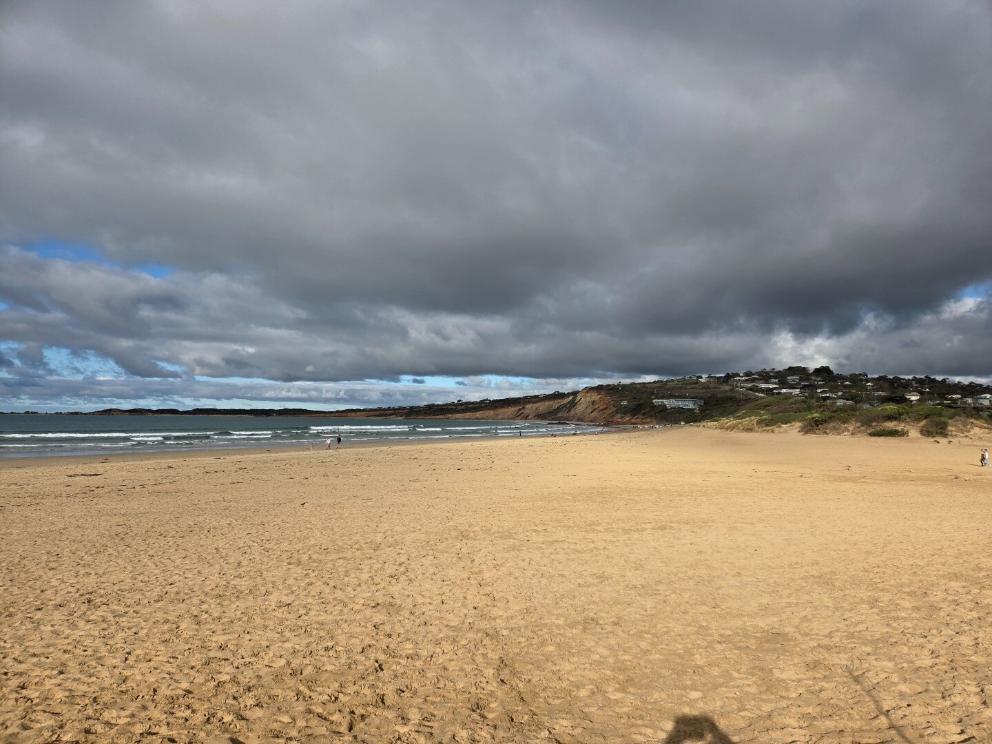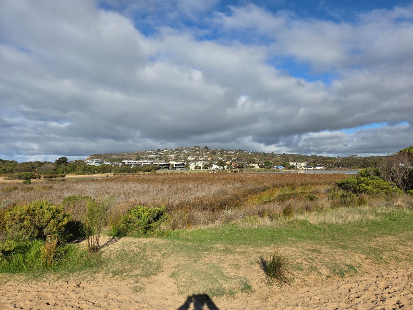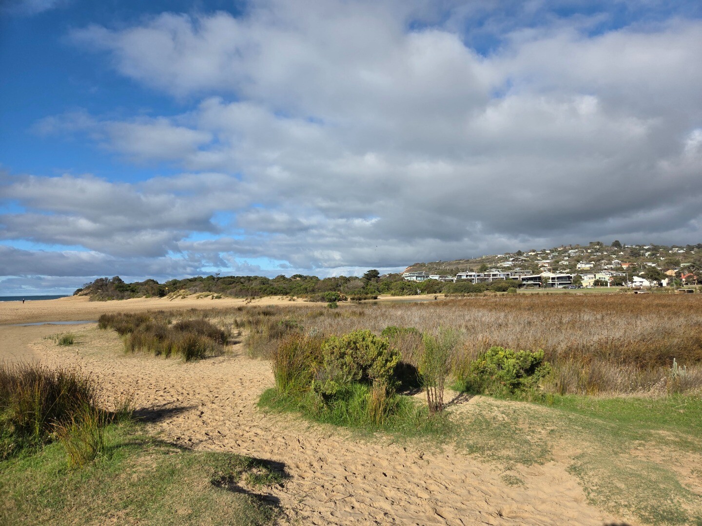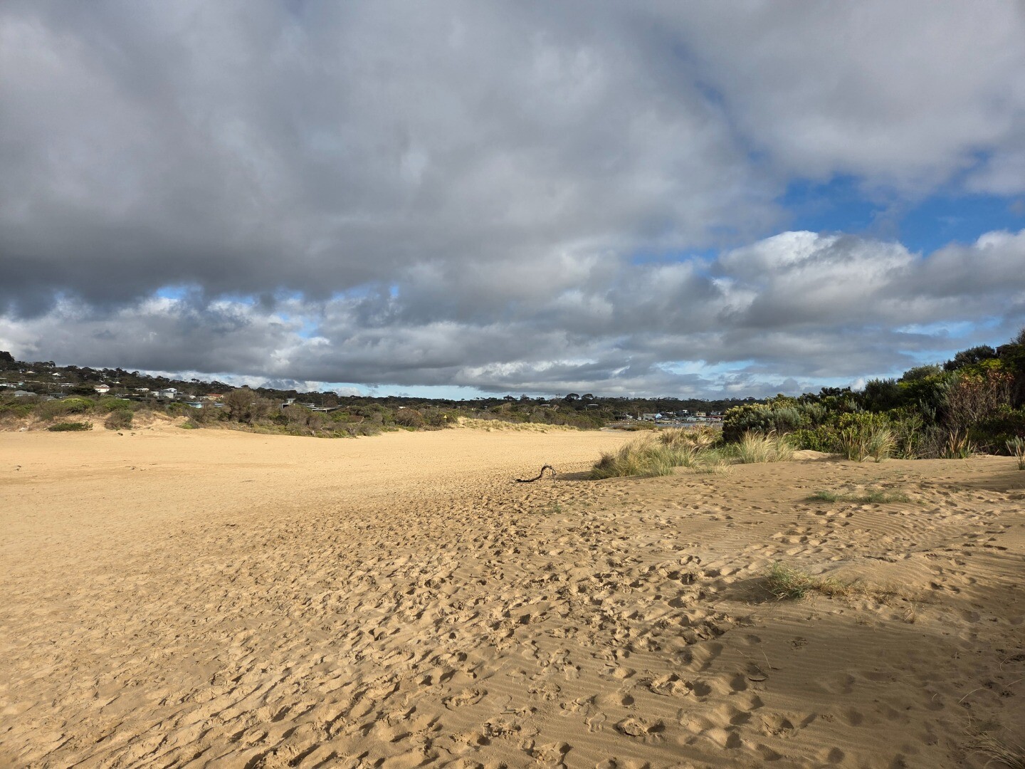 Top of Berm was 144m from nearest Estuary water. 76m from top of Berm to sea. (low tide) Clear evidence on beach of Berm being overtopped by sea the previous night. Wet sand and seaweed. Note Level Board at Ocean Road Bridge was fouled and unreadable, 1.2m is the best estimate