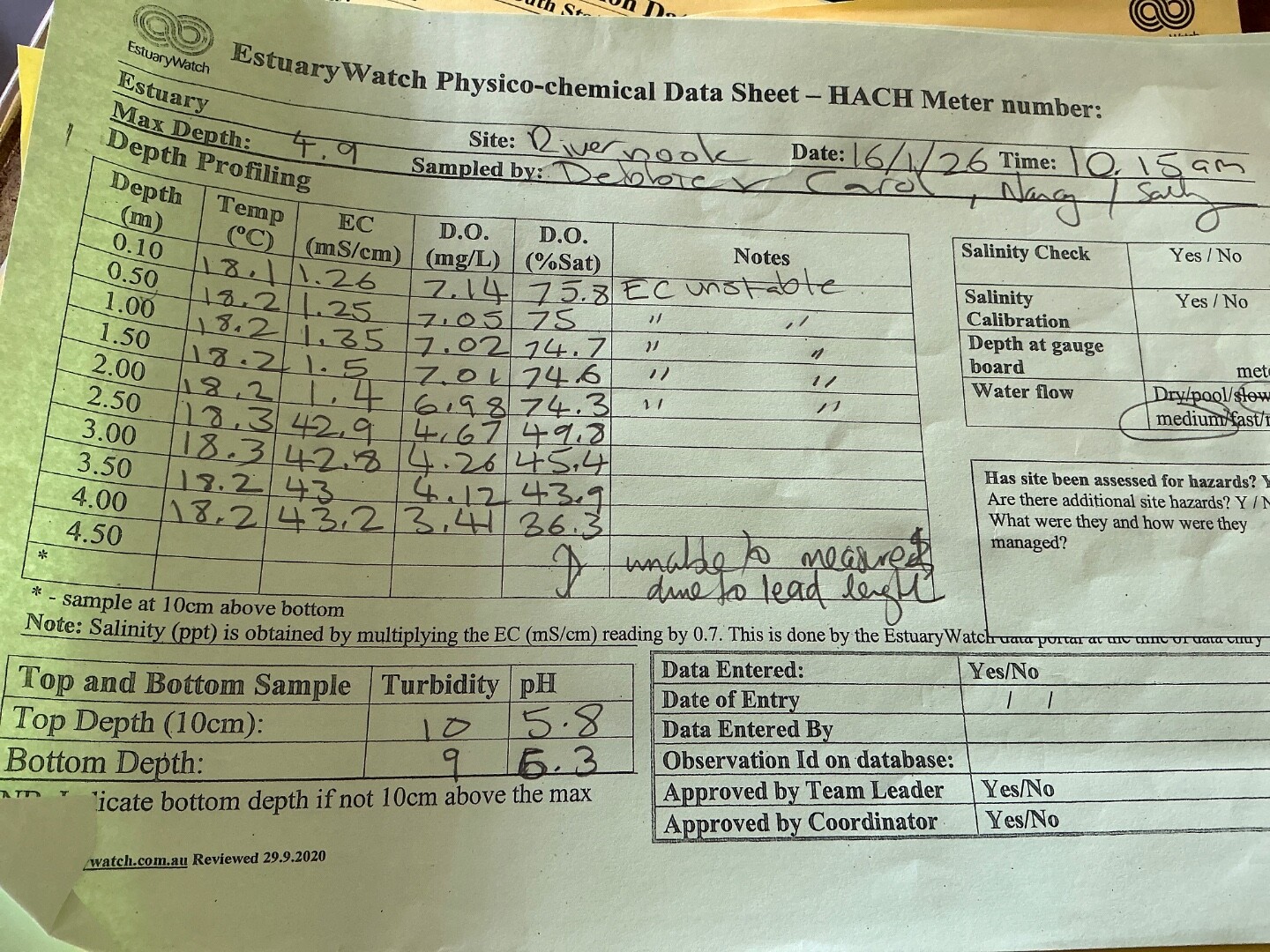 Debbie Ferrari also sampling Wind up so flow looks slow but is most likely pooled Strong stagnant odour in bottom depth sample |