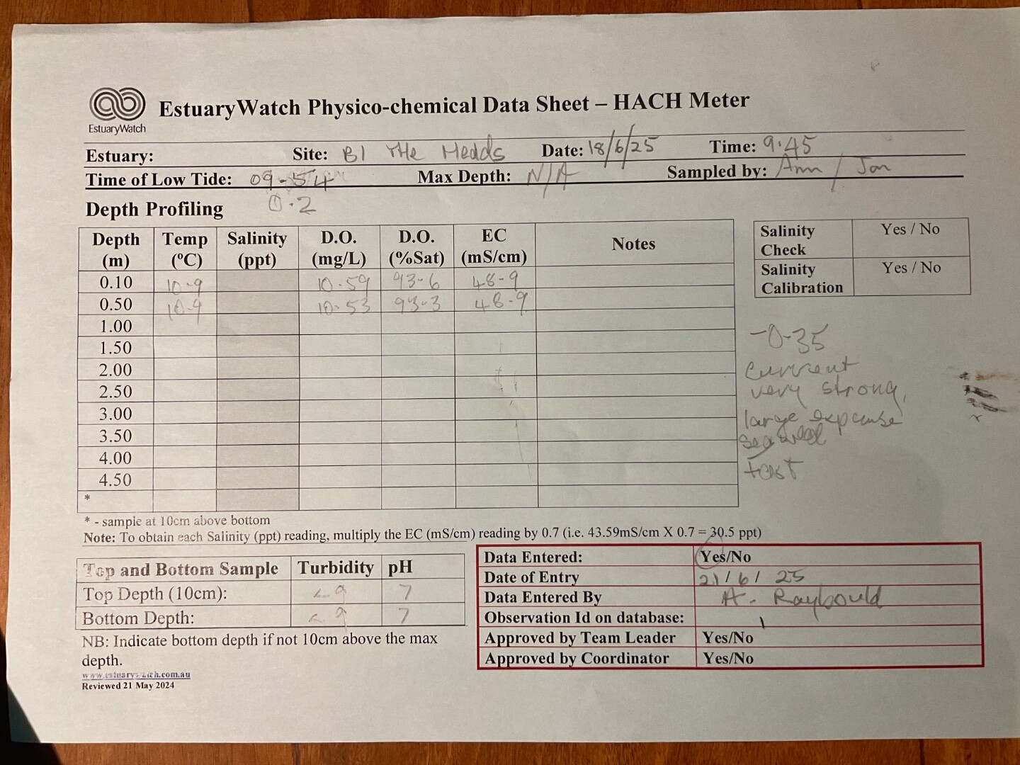 We did not take deeper profile readings due to very strong outward tidal flow.