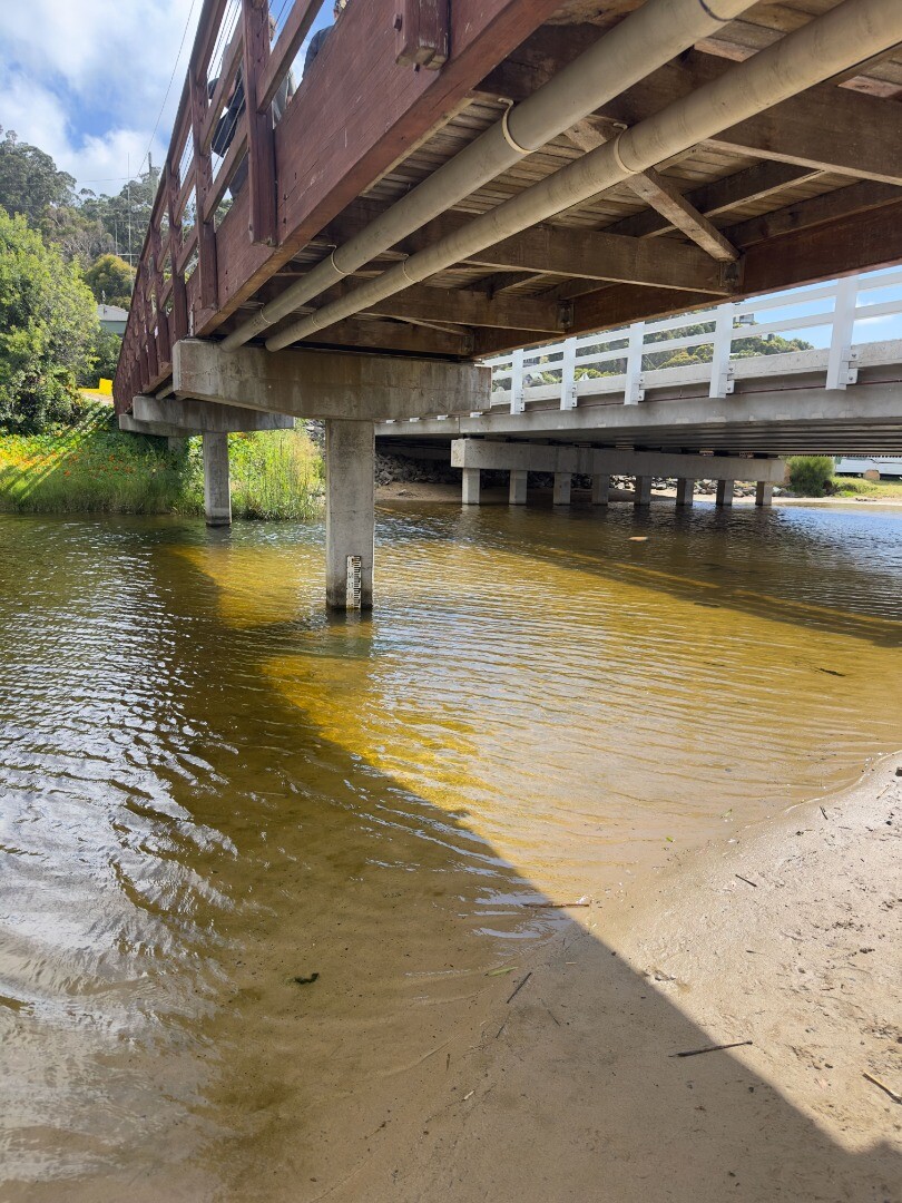 Water level below depth gauge. River diverted under bridge to accommodate major works replacing Great Ocean Road Wye River bridge.. |