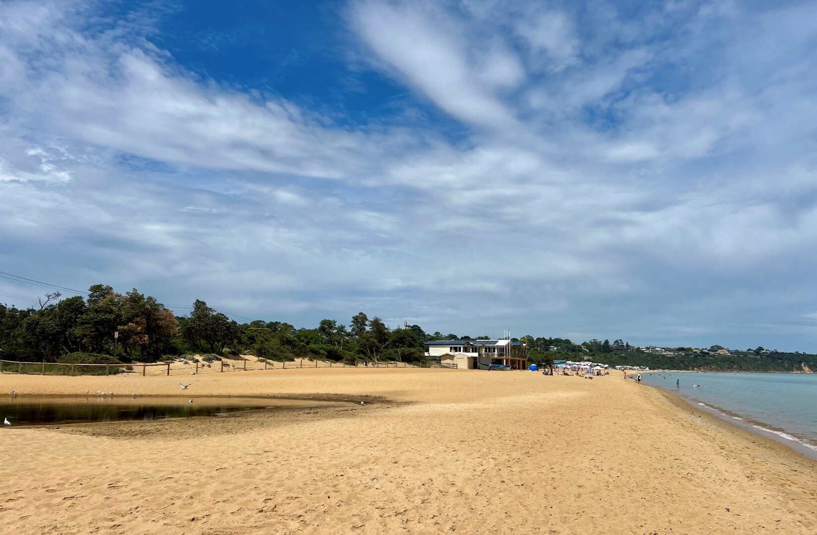 At medium tide height dropping. Berm open with outflow