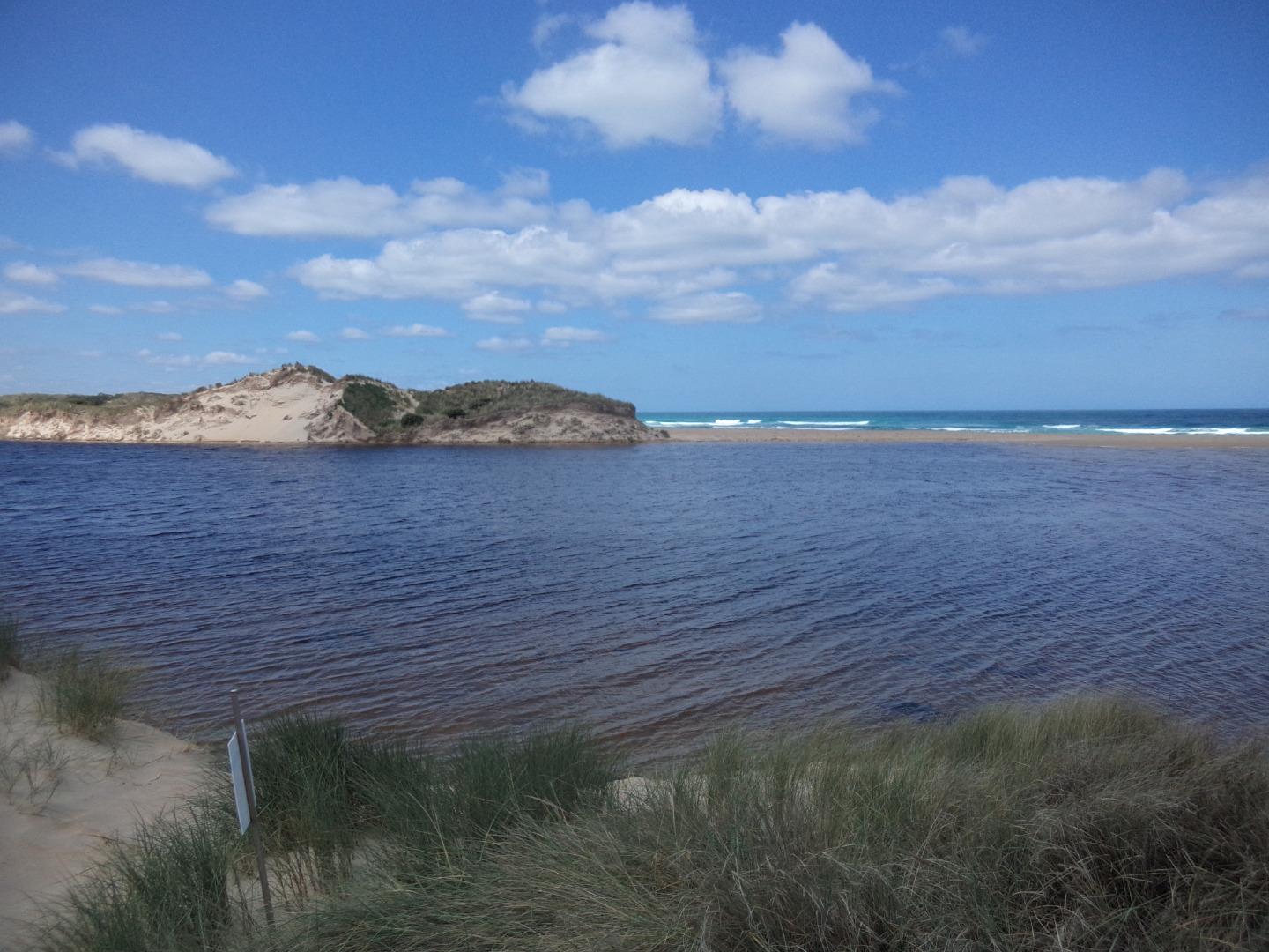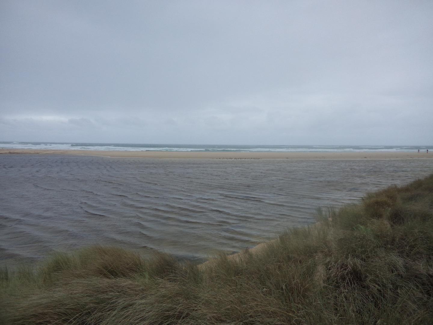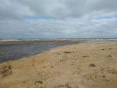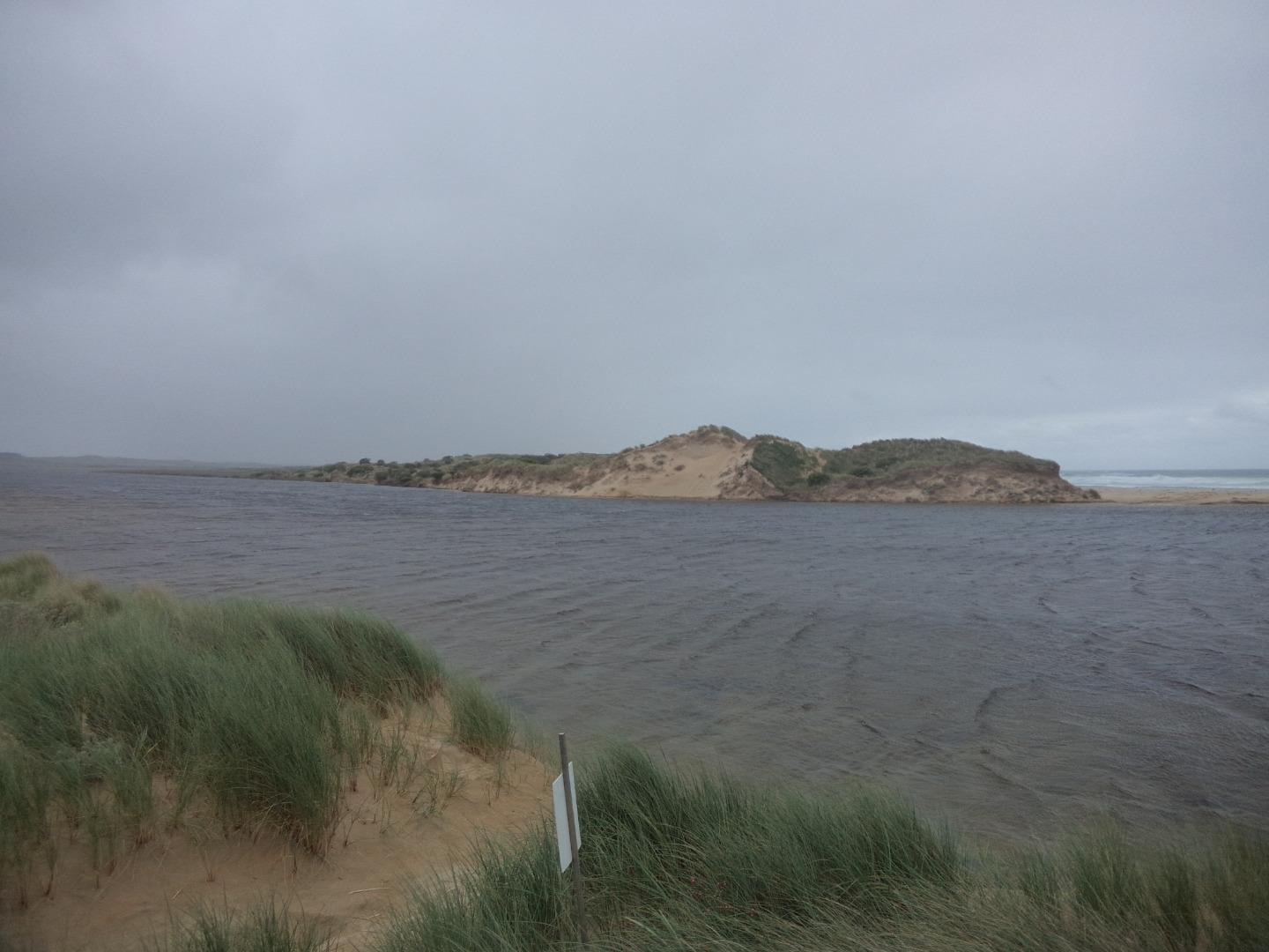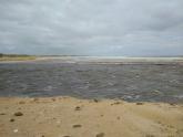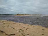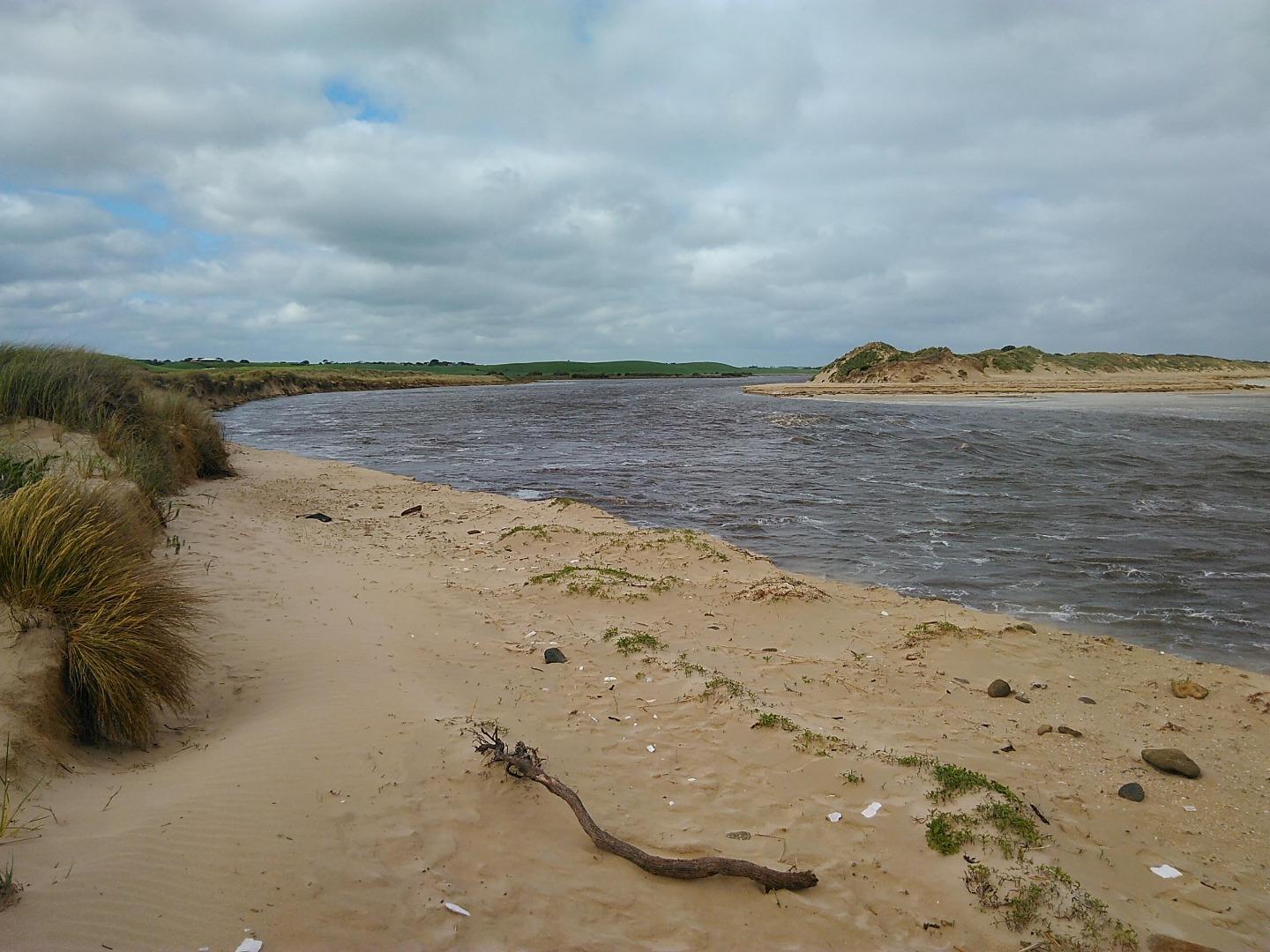 Tom Sheehan part of monitoring group. High tide sea water flows into river estuary. Natural opening during August-bank erosion. River level cut off from photo point. Good swell. |