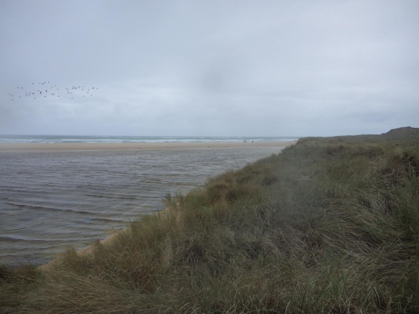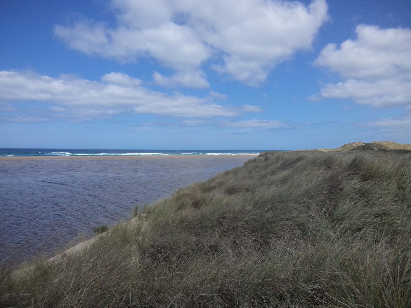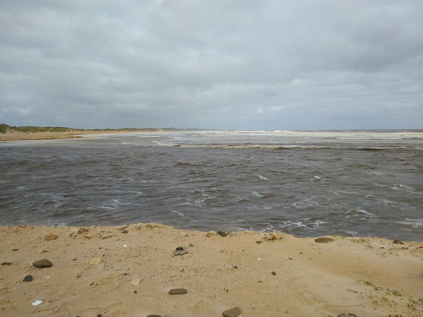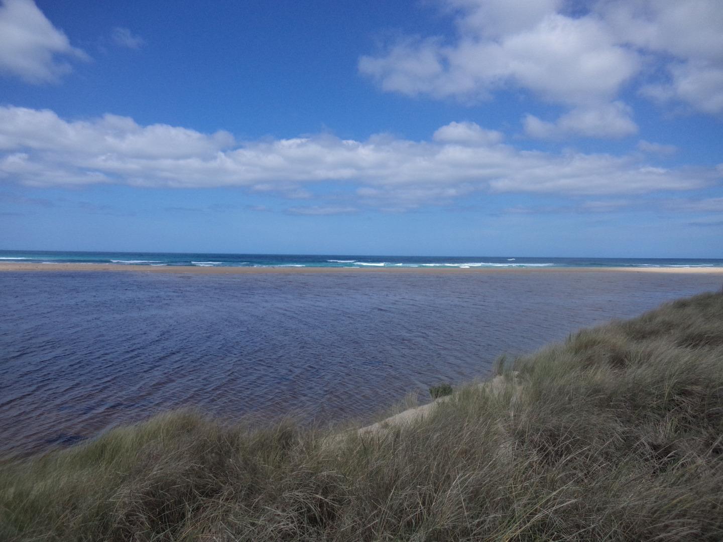 Tom Sheehan part of monitoring group. High tide sea water flows into river estuary. Natural opening during August-bank erosion. River level cut off from photo point. Good swell. |