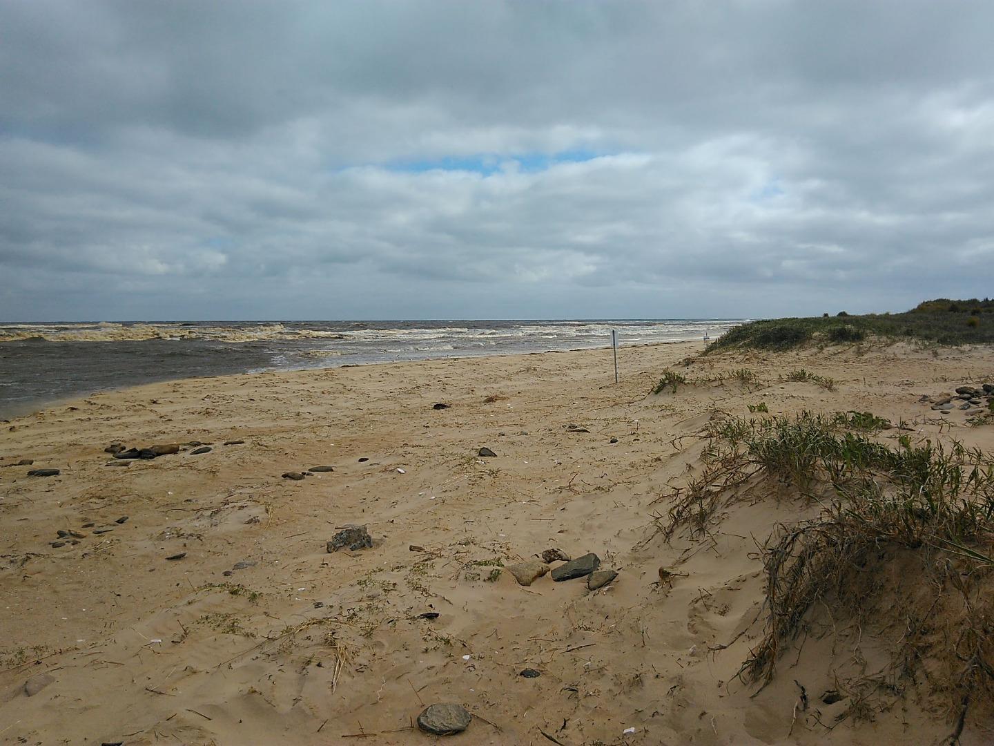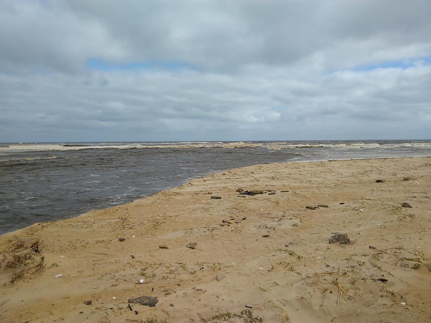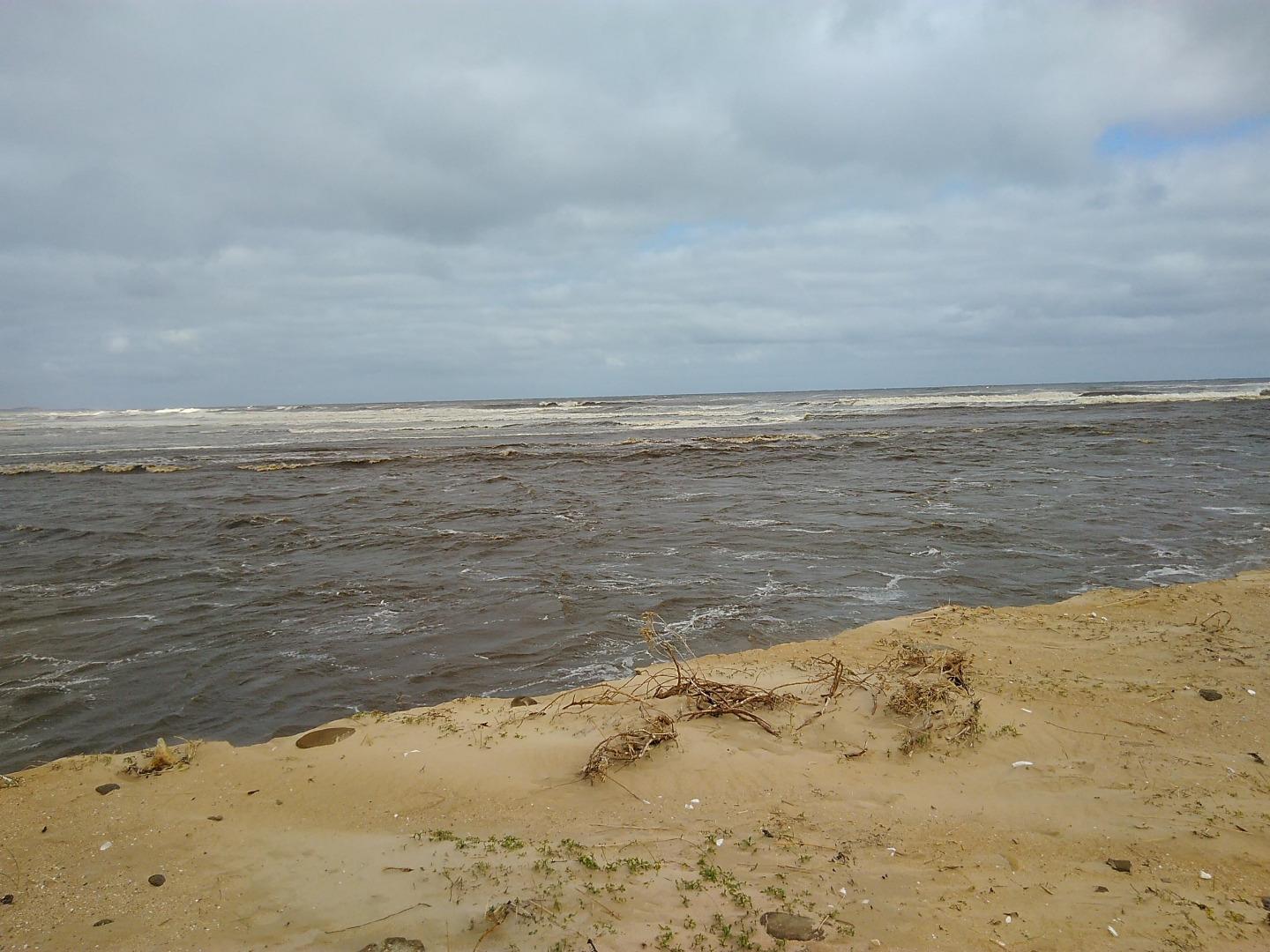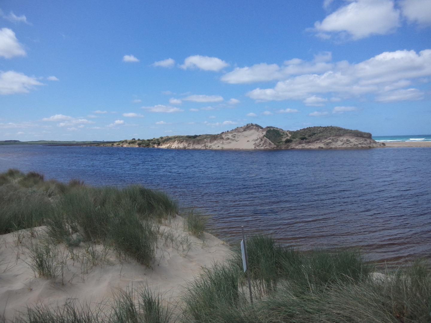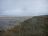Tom Sheehan part of monitoring group. High tide sea water flows into river estuary. Natural opening during August-bank erosion. River level cut off from photo point. Good swell. |