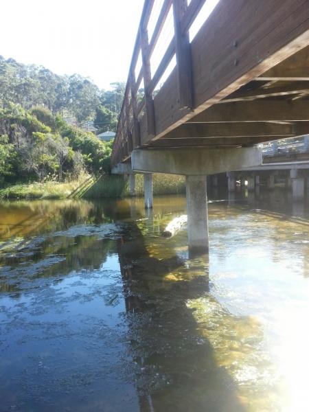 River between bridge and sea like a large very still lagoon with lots of algae - 2 schools of little fish observed.