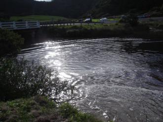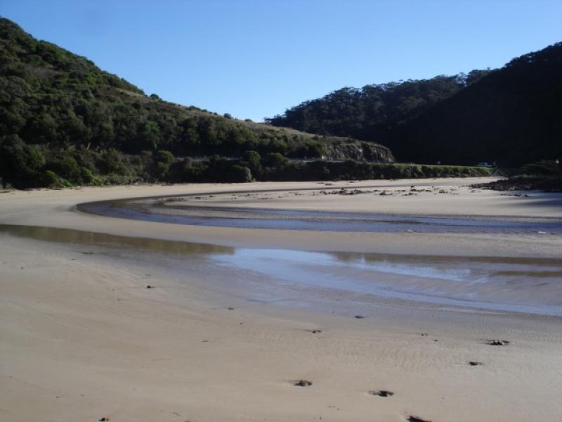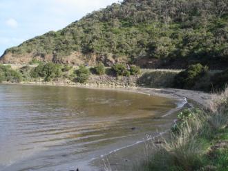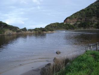 Water fills whole estuary at high tide.Path of river moving towards south side of estuary.Rocks on north side becoming exposed. Dead pelican on beach.Unusual? Graffiti at Teddys lookout. 4 photos taken at high tide from car park.