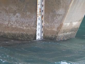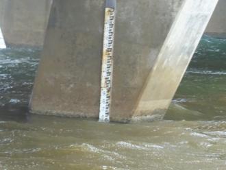 Ther was a distinct change in the colour of the water at the pontoon, in a line at about 30 degrees to the pontoon, with darker brown water near the pontoon, lighter brown further out. See the photo.