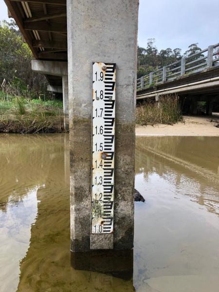 The water level was below the scale on the height measuring board in the river - so we made an estimate see photo 3