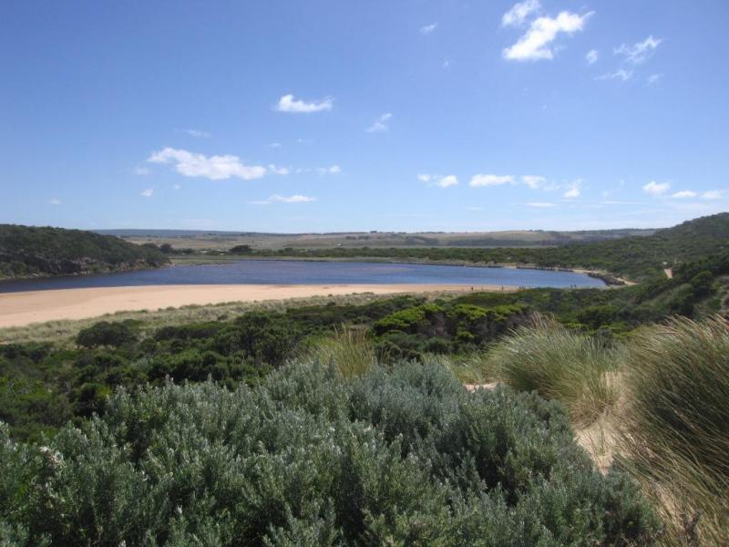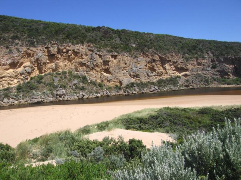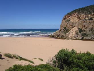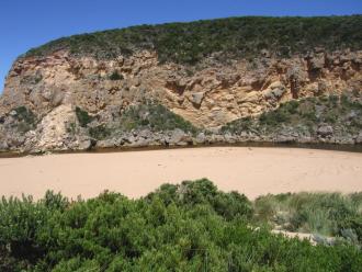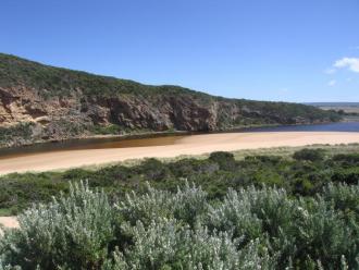Small silver fish around green rock at mouth; against bank in shelter beside turbulent water. Lots of sand at mouth, water shallow. 9/1/09 huge waves going out and sand cliffs falling. sand has been dumped from waves coming east along thebeach to rocks at east end, then going out to sea.