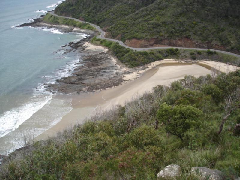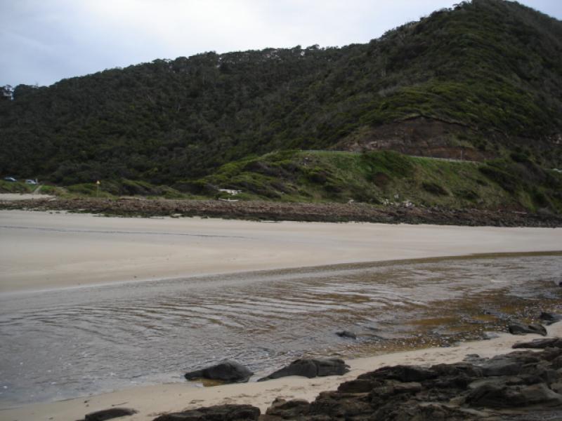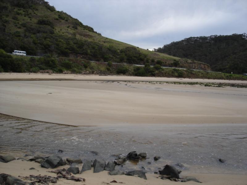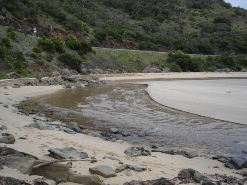 River has washed deep into sand on southern side of estuary. Rock exposed. Due to heavy rain and high tides? Tide times Port Phillip Heads minus 20 minutes.
