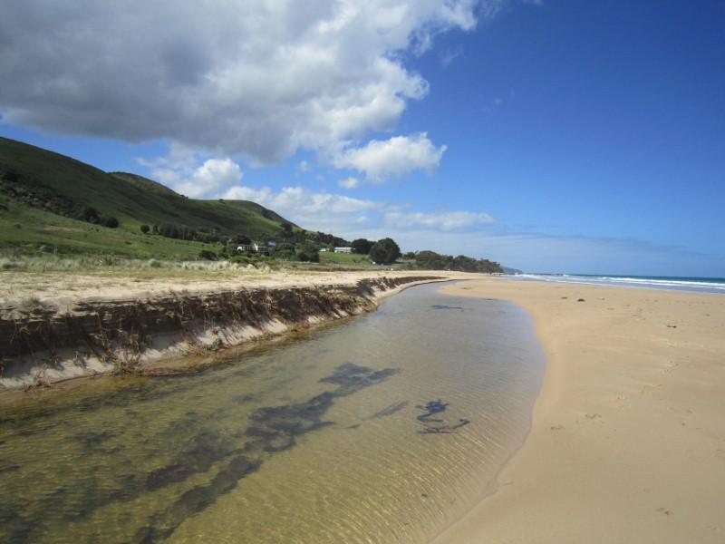 The outlet has moved back towards the middle of the beach about 200 m from the west end. Sand has piled up at the back of the beach and the river has cut a bank 1.5-2m deep. Sand continues to pile up at the west wall.