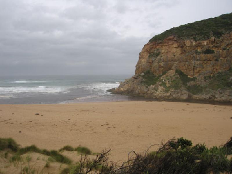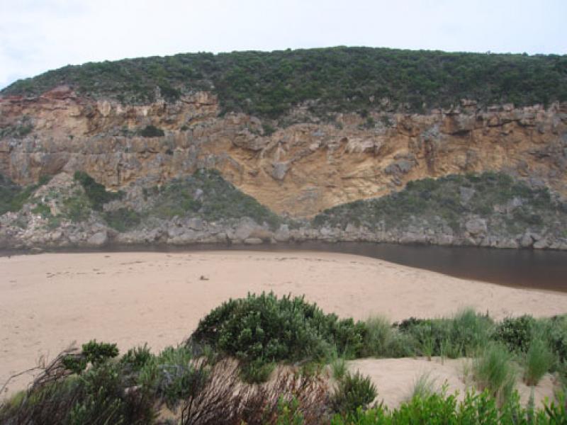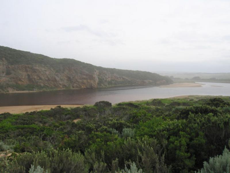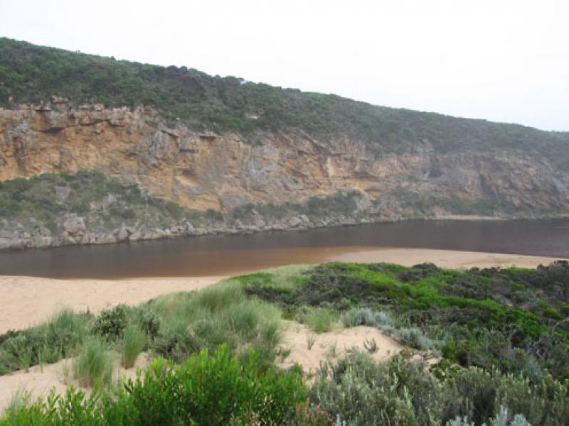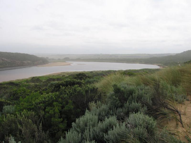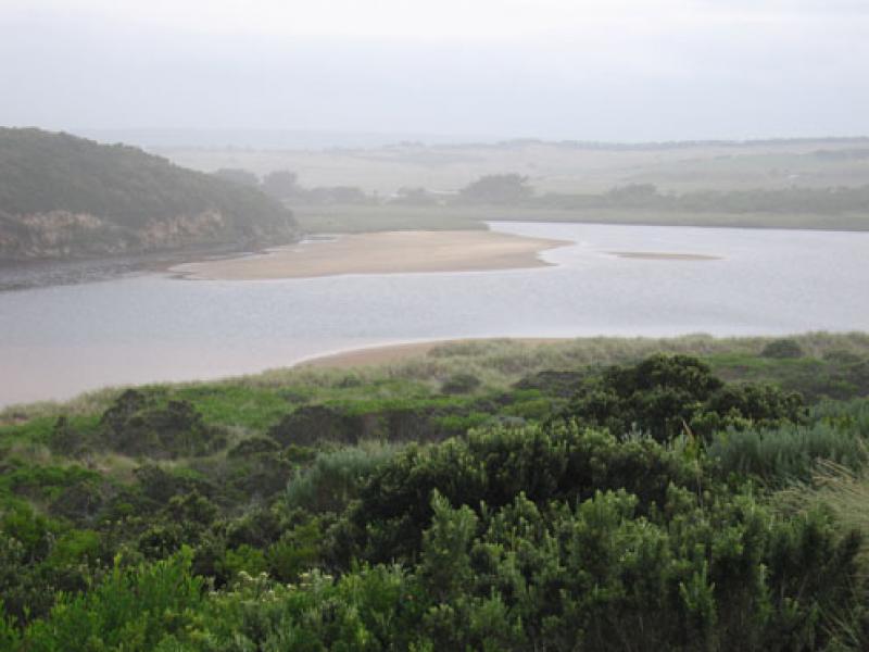 1. Discharge around mouth & to west 2. More sand around mouth, channel only flowing between rocks & cliff, more sand on east side of rocks 3. Hooded plover (2) feeding along hi tide area 4. Great Comorant (1) on beach 5. Many crows around estuary