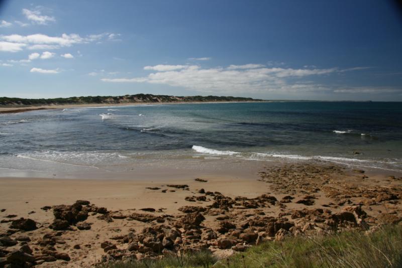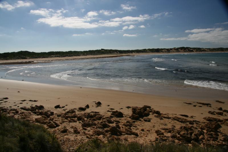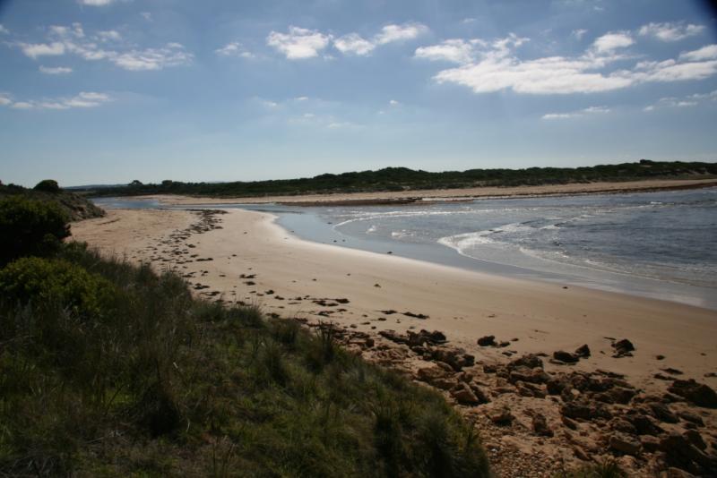 Ocean very clean. You can see sand through water. Onshore winds. Openning to ocean is very narrow. Families sitting/playing along the estuary with dogs.